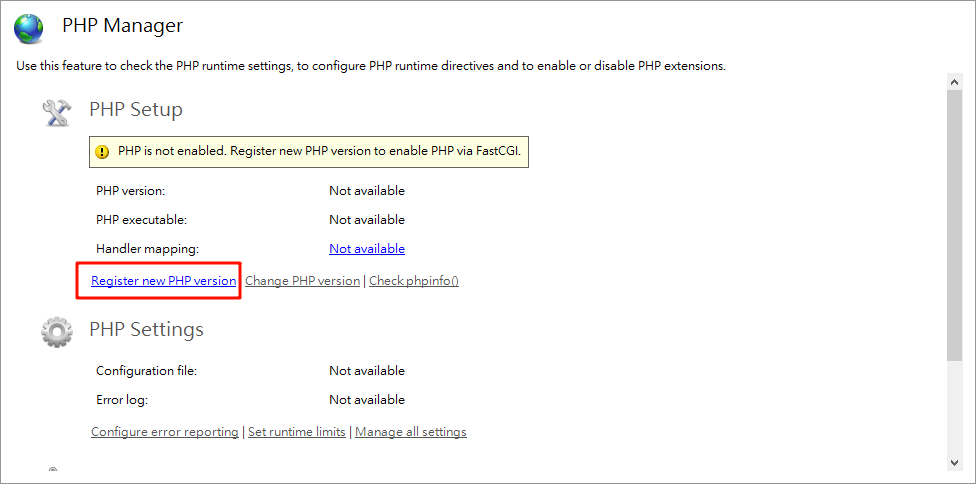 打開 IIS 後點選 PHP Manager 如下圖點選註冊 PHP 版本