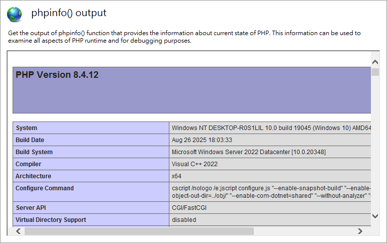 配置完成後點選 Check phpinfo() 出現下面畫面代表配置成功