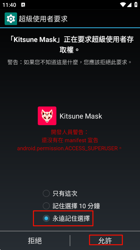 後續如果出現需要 Root 權限,確認是自己安裝的 APP 直接允許即可