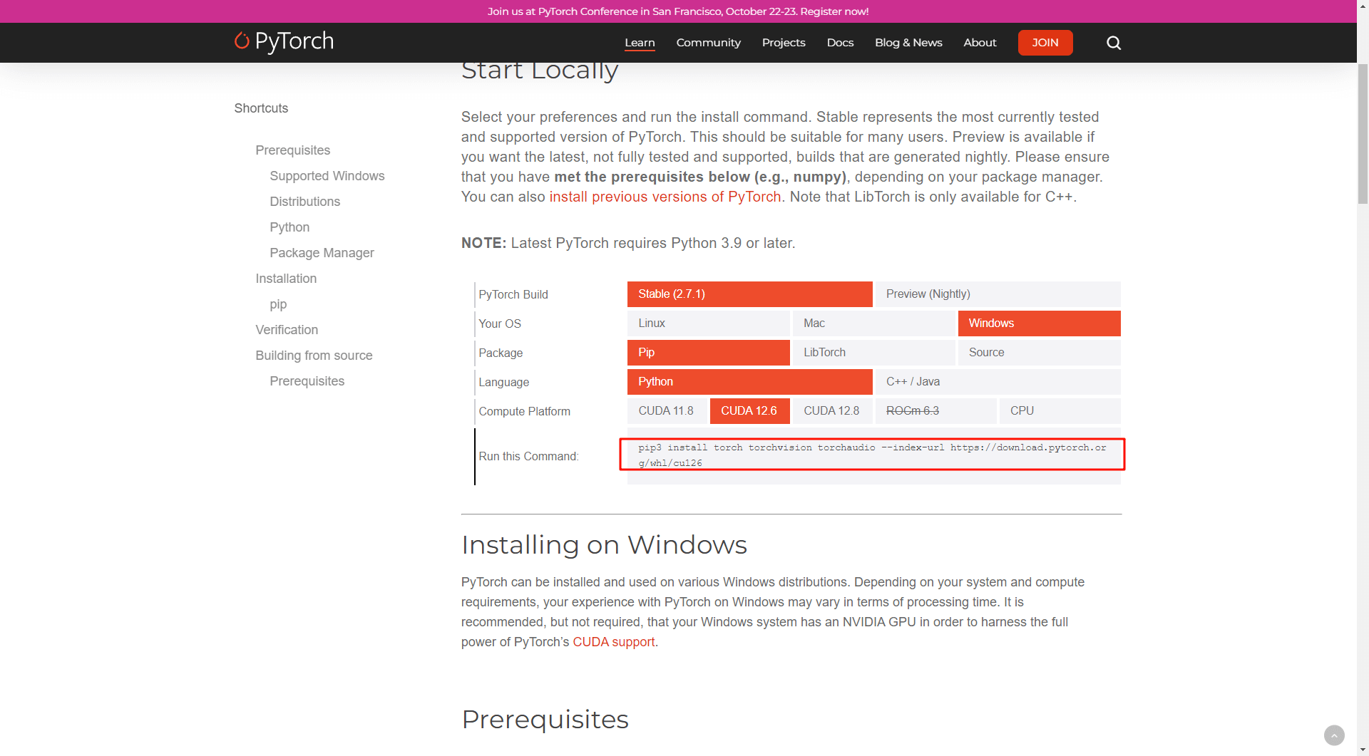 打 PyTorch 網站 根據版本選擇對應的命令