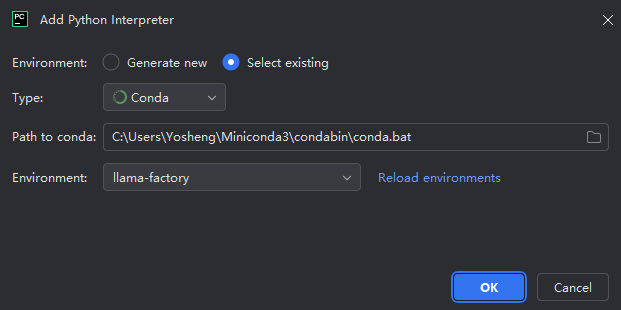 使用 PyCharm 打開 LLaMA-Factory 並參考如下配置